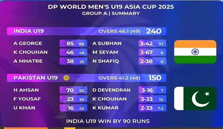 انڈر 19 ایشیا کپ : انڈیا نے پاکستان کو 90 رنز سے ہرادیا