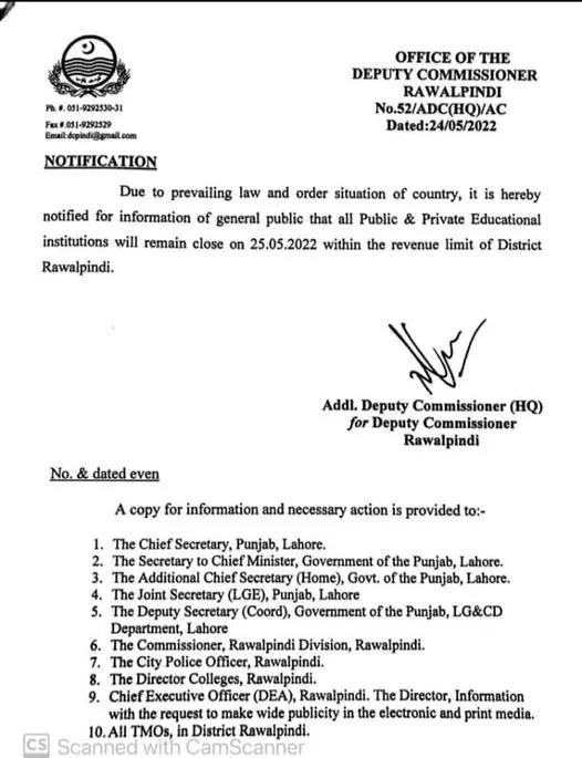پاکستان تحریک انصاف کی جانب سے اعلان کردہ آزادی مارچ کے پیش نظر راستوں کی بندش اور سکیورٹی صورتحال کے باعث راولپنڈی اسلام آباد میں کل تمام نجی و سرکاری تعلیمی ادارے بند رہیں گے جبکہ شیڈول امتحانات کو بھی منسوخ کردیا گیا ہے جن کے انعقاد کا اعلان بعد میں کیا جائیگا،ترجمان لاہور بورڈ کے مطابق میٹرک کا کل ہونے والا مطالعہ پاکستان کا پرچہ منسوخ کردیاگیا، پرچے کے دوبارہ انعقاد کی تاریخ کا اعلان بعد میں کیا جائےگا۔