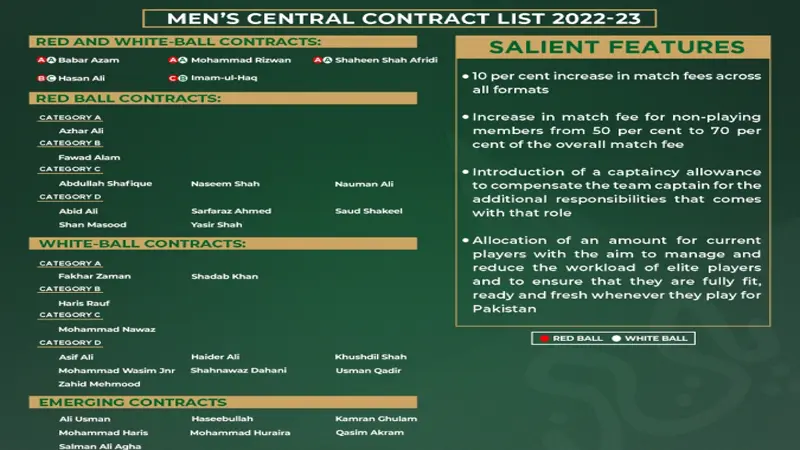 پاکستان کرکٹ بورڈ نے مینز سینٹرل کنٹریکٹ برائے 23-2022 کا اعلان کردیا ہے۔ نئے سینٹرل کنٹریکٹ کا اطلاق یکم جولائی سے ہوگا، جہاں ریڈبال اور وائیٹ بال دونوں کی مختلف کٹیگریز میں مجموعی طور پر 33 کھلاڑیوں کو شامل کیا گیا ہے۔ گزشتہ سیزن میں پی سی بی نے 20 کھلاڑیوں کو سینٹرل کنٹریکٹ دیا تھا۔
