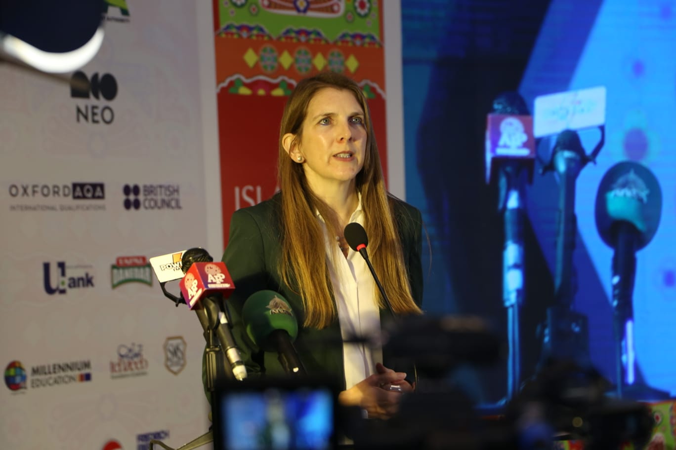 افتتاحی تقریب سے خطاب کرتے ہوئے برطانیہ کی ہائی کمشنر جین میریٹ کا کہنا تھا کہ پاکستان میں اردو ادب کے ساتھ ساتھ انگریزی ادب بھی پنپ رہا ہے، انہوں نے کہا کہ پاکستان اور برطانیہ کے درمیان ہمہ جہت تعلقات موجود ہیں جو وقت کے ساتھ بڑھ رہے ہیں۔ جین میریٹ نے آکسفورڈ یونیورسٹی پریس کو اسلام آباد اور کراچی میں ادبی میلوں کے انعقاد پر مبارک باد دی اور کہا کہ اایسے ادبی میلوں سے معاشرے میں ہم آہنگی پیدا ہو تی ہے۔