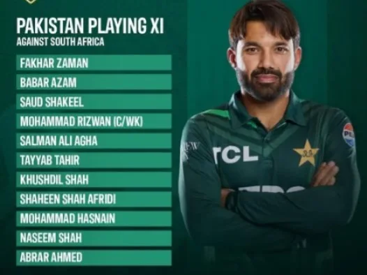 جاری سہ فریقی کرکٹ سیریز میں پاکستان نے جنوبی افریقہ کے خلاف میچ کے لیے پلیئنگ الیون کا اعلان کر دیا۔اکستان کرکٹ بورڈ (پی سی بی) کے مطابق جنوبی افریقہ کے خلاف اہم میچ میں کپتانی کے فرائض محمد رضوان انجام دیں گے۔