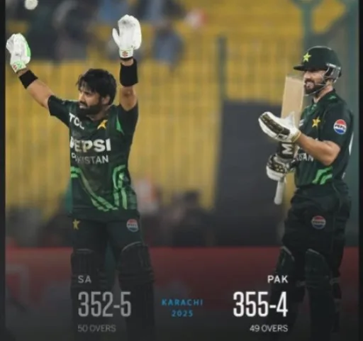 سہ ملکی سریز کے اہم میچ میں پاکستان نے جنوبی افریقا کو شکست دے کر فائنل کے لیے کوالیفائی کرلیا۔نیشنل بینک اسٹیڈیم کراچی میں کھیلےگئے میچ میں جنوبی افریقا نے پہلےکھیلتے ہوئے پاکستان کو 353 رنز کا ہدف دیا جو قومی ٹیم نے محمد رضوان اور سلمان آغا کی شاندار سنچریوں کی بدولت 4 وکٹوں کے نقصان پر 49 اوور میں پورا کرلیا۔