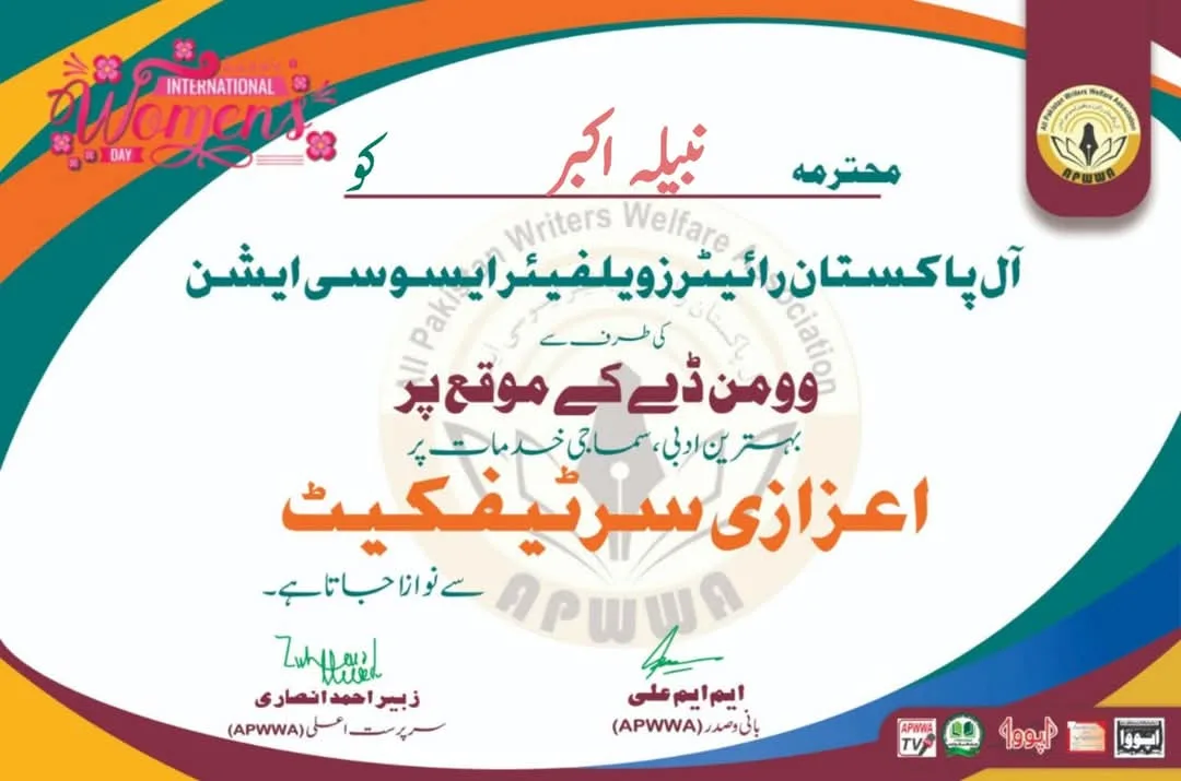 آل پاکستان رائٹرز ویلفیئر ایسوسی ایشن کی طرف سے معروف قلمکارہ نبیلہ اکبر کو بہترین ادبی اور سماجی خدمات کے اعتراف میں حسن کارکردگی سرٹیفکیٹ