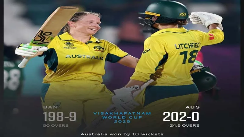 ویمنز ورلڈ کپ کے 17ویں میچ میں آسٹریلوی ٹیم نے بنگلہ دیش کو چاروں شانے چت کر دیا۔بھارتی شہر وشاکا پٹنم میں کھیلے گئے میچ میں آسٹریلیا نے بنگلہ دیش کی نو آموز ٹیم کو پورے میچ میں دبوچ کر رکھا اور کمزور حریف کو بآسانی 10 وکٹوں سے شکست دے کر سیمی فائنل میں جگہ بنا لی۔کینگروز نے بنگلہ دیش کی جانب سے 199 رنز کا دیا گیا آسان ہدف بغیر کسی وکٹ کے نقصان کے 25ویں اوور میں حاصل کیا۔کپتان ایلیسا ہیلی نے مسلسل دوسری سنچری اسکور کرتے ہوئے ناٹ آؤٹ 113 رنز کی اننگز کھیلی جبکہ فیبی لیچ فیلڈ نے 84 رنز بنا کر کپتان کا ساتھ دیا۔