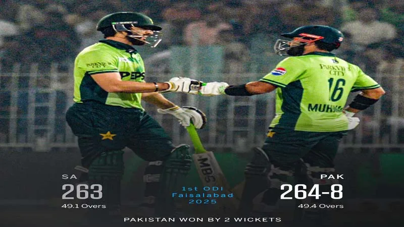 پاکستان نے 3 ون ڈے میچز کی سیریز کے پہلے میچ میں جنوبی افریقا کو دلچسپ مقابلے کے بعد 2 وکٹوں سے شکست دے کر سیریز میں 0-1 کی برتری حاصل کرلی۔پاکستان نے جنوبی افریقا کا 264 رنز کا ہدف آخری اوور میں 8 وکٹوں کے نقصان پر حاصل کرلیا۔فیصل آباد میں کھیلے گئے میچ میں پاکستان نے جنوبی افریقا کے خلاف ٹاس جیت کر فیلڈنگ کا فیصلہ کیا۔فیصل آباد میں 17 سال بعد انٹرنیشنل کرکٹ کی رونقیں بحال ہوئی ہیں۔