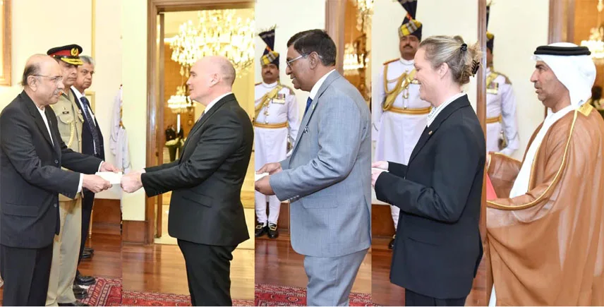 صدرِ مملکت آصف علی زرداری کو 4 ممالک کے سفیروں نے اپنی اسنادِ سفارت پیش کردیں۔ایوانِ صدر آمد پر غیر ملکی سفیروں کو پاک افواج کے چاق و چوبند دستے نے گارڈ آف آنر پیش کیا، صدر نے نئے تعینات سفیروں کو مبارک باد دیتے ہوئے دو طرفہ تعلقات کے مزید فروغ کی امید ظاہر کی۔صدر نے آسٹریلیا کے ہائی کمشنر ٹم کین سے ملاقات میں تجارت، سرمایہ کاری اور تعلیم کے شعبوں میں تعاون بڑھانے پر زور دیتے ہوئے کہا کہ آسٹریلیا میں پاکستانی طلبہ اور کمیونٹی دونوں ممالک کے درمیان پل کا کردار ادا کر رہے ہیں۔