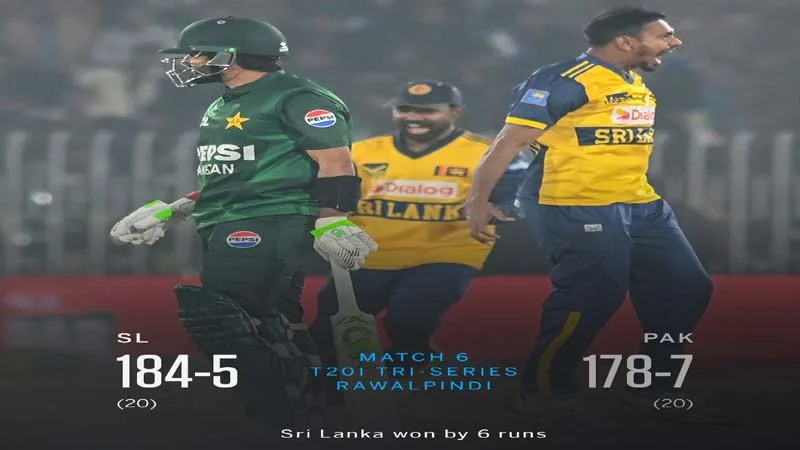 سہ ملکی ٹی ٹوئنٹی سیریز کے میچ میں سری لنکا نے پاکستان کو دلچسپ مقابلے کے بعد 6 رنز سے شکست دے دی اور فائنل کے لیےکوالیفائی کرلیا جب کہ زمبابوے سیریز سے باہر ہوگیا۔ راولپنڈی کرکٹ اسٹیڈیم میں کھیلے گئے میچ میں پاکستان نے سری لنکا کے خلاف ٹاس جیت کر فیلڈنگ کا فیصلہ کیا۔