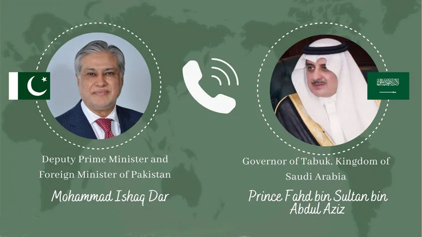 نائب وزیراعظم اسحاق ڈار کو سعودی عرب کے صوبہ تبوک کے گورنر شہزادہ فہد بن سلطان بن عبدالعزیز کی جانب سے ٹیلی فون کال موصول ہوئی۔