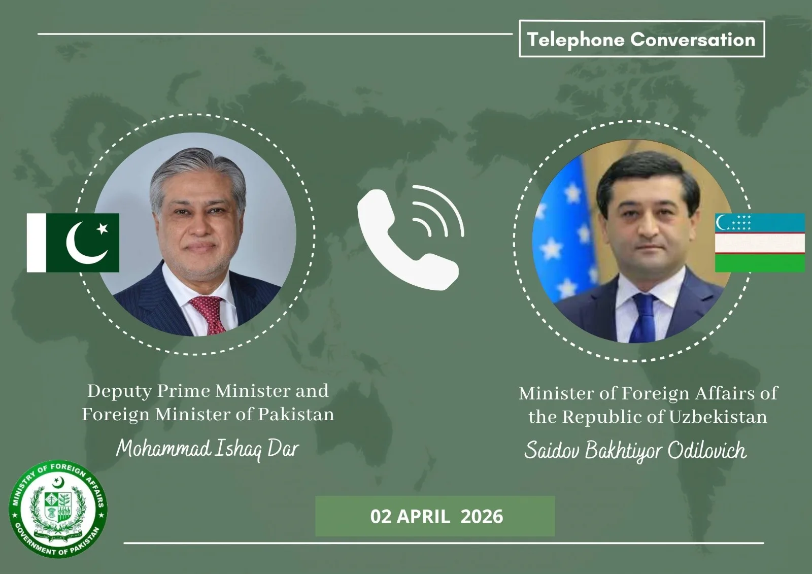 نائب وزیراعظم اور وزیر خارجہ، سینیٹر محمد اسحاق ڈار نے ازبکستان کے وزیر خارجہ Bakhtiyor Saidov سے ٹیلی فون پر بات کی۔ازبکستان کے وزیرخارجہ نے علاقائی امن، استحکام اور کشیدگی میں کمی کے لیے پاکستان کے فعال کردار کی تعریف کی اور اسلام آباد میں چار وزرائے خارجہ کے حالیہ اجلاس کی میزبانی پر پاکستان کی قیادت کو سراہا۔ انہوں نے خلیج اور مشرق وسطیٰ میں امن و استحکام کو فروغ دینے کے لیے پاک چین پانچ نکاتی اقدام کی مکمل حمایت کا بھی اظہار کیا۔دونوں رہنماؤں نے حالیہ علاقائی صورتحال کا بھی جائزہ لیا اور باہمی دلچسپی کے امور پر قریبی رابطہ برقرار رکھنے پر اتفاق کیا۔