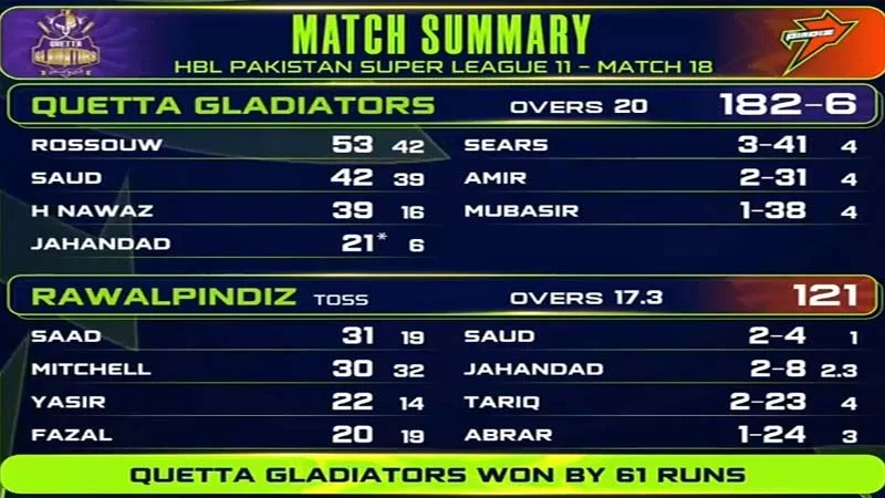 پاکستان سپر لیگ ایڈیشن 11 کے 18 ویں میچ میں کوئٹہ گلیڈی ایٹرز نے راولپنڈیز کو 61 رنز سے شکست دیدی۔راولپنڈی کی ٹیم گلیڈی ایٹرز کی جانب سے دیے گئے 183 رنز کے ہدف کے تعاقب میں 18ویں اوور میں121 رنز پر ہی ڈھیر ہو گئی۔راولپنڈیز کی جانب سے سعد مسعود 31 رنز بنا کر نمایاں رہے، ڈیرل مچل 30، یاسر خان 22 اور عبداللہ فضل 20 رنز بنا کر پویلین لوٹے جبکہ دیگر کوئی کھلاڑی ڈبل فگر میں بھی داخل نہ ہو سکا۔
