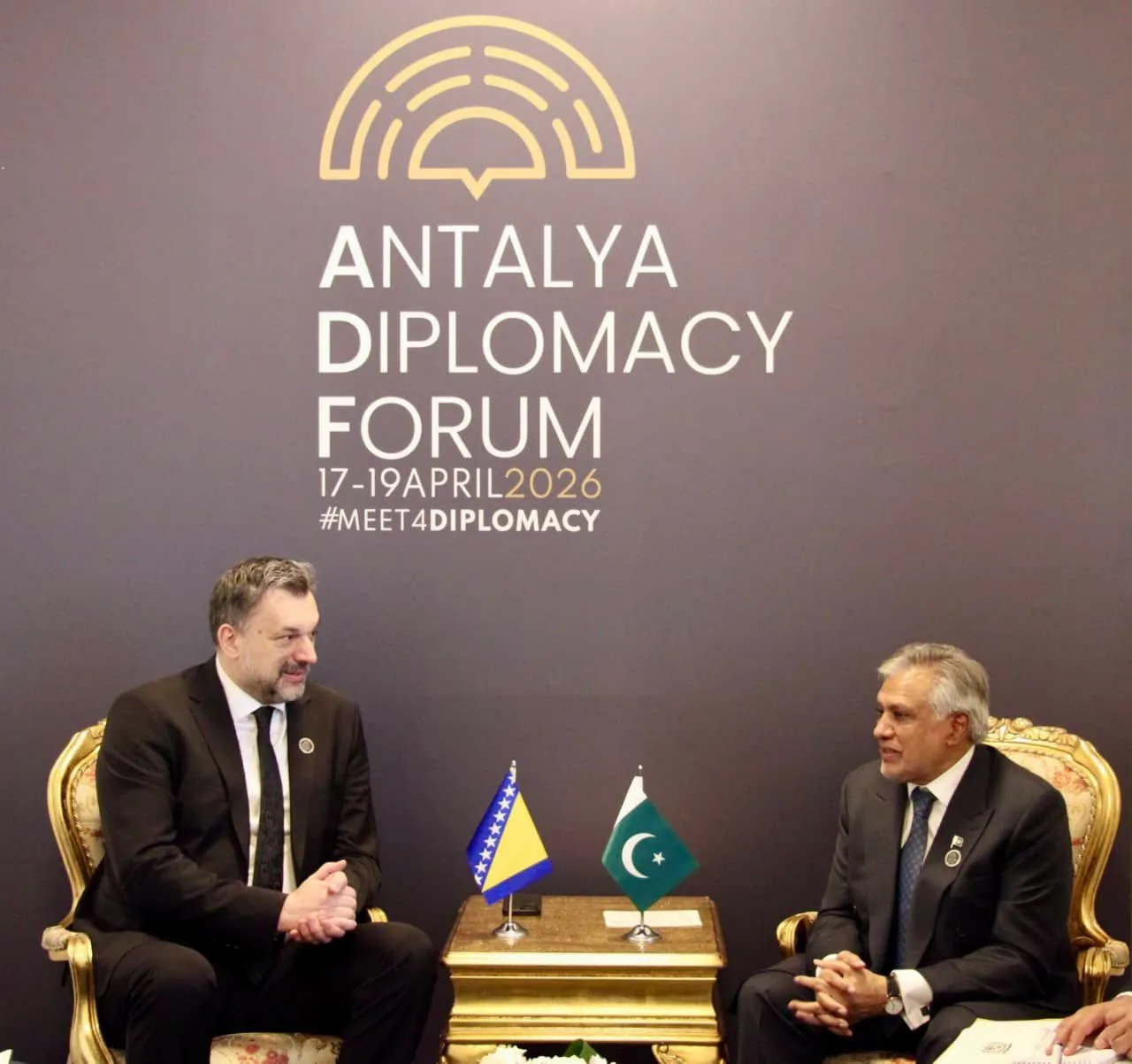 نائب وزیراعظم و وزیر خارجہ اسحاق ڈار نے جمعہ کے روز بوسنیا و ہرزیگووینا کے وزیر خارجہ ایلمیدن کوناکووچ سے ملاقات کی۔یہ ملاقات انطالیہ ڈپلومیسی فورم 2026 کے موقع پر ترکی کے شہر انطالیہ میں ہوئی۔