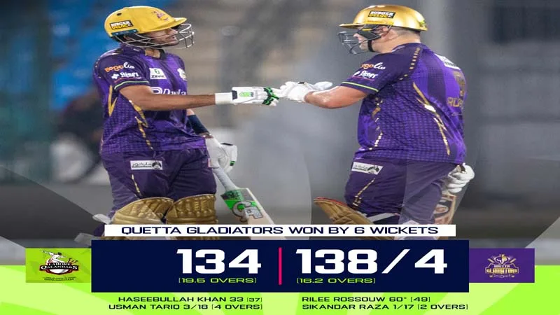 کوئٹہ گلیڈی ایٹرز نے لاہور قلندرز کی جانب سے ملنے والا 135 رنز کا ہدف 17 ویں اوور میں 4 وکٹوں کے نقصان پر باآسانی حاصل کرلیا۔