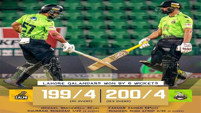 لاہور قلندرز نے 200 رنز کا ہدف آخری اوور میں حاصل کرلیا۔ لاہور قلندرز کی جانب سے فخر زمان 58 اور ڈینئل سیمز 35 رنز بنا کر ناٹ آؤٹ رہے۔پشاور زلمی کی پی ایس ایل 11 میں یہ پہلی شکست ہے، لاہور قلندرز کی فتح کے بعدکراچی کنگز کی ٹیم پلے آف کی دوڑ سے باہر ہوگئی۔