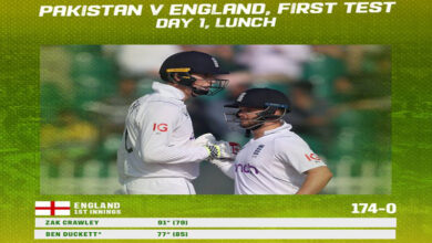 پاکستان اور انگلینڈ کے درمیان راولپنڈی کرکٹ سٹیڈیم میں جاری پہلے ٹیسٹ میچ کے پہلے روز کھانے کے وقفے تک…